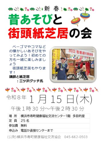 | 1月15日(木) | 13:00~14:30 | 【バラエティ講座】新春・昔あそびと街頭紙芝居の会(詳細PDF) | 多目的室 | 参加自由 |