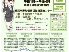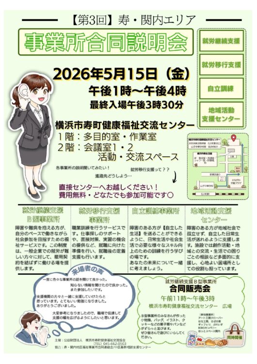 | 5月15日(金) | 13:00~16:00 | 寿・関内エリア 事業所合同説明会(詳細pdf) | 1階 多目的室・作業室 2階 会議室1・2 活動交流スペース | 参加自由 |