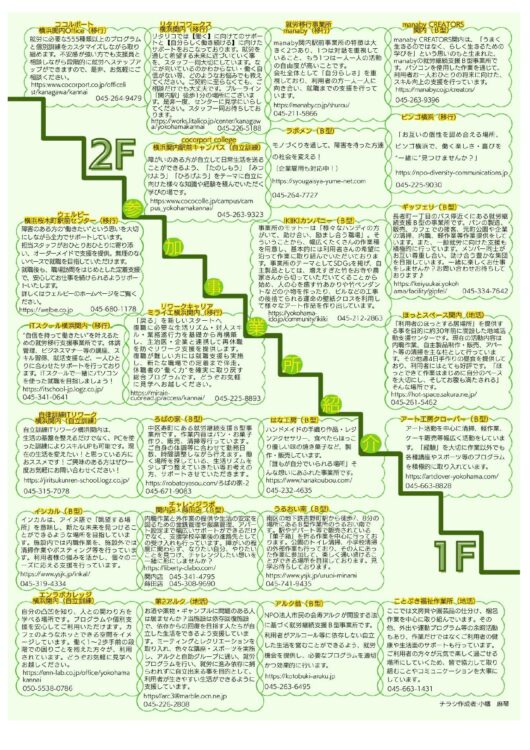 自立訓練ITリワーク 横浜関内(自立訓練)/ろばの家(B型)/はな工房(B型)/アート工房クローバー(B型)/インカル(B型)/チャレンジラボ 関内店・蒔田店(B型)/うるおい南(B型)/エンラボカレッジ 横浜関内(自立訓練)/第2アルク(地活)/アルク翁(B型)/ことぶき福祉作業所(地活)/ほっとスペース関内(地活)